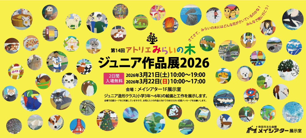 『第14回アトリエみらいの木 ジュニア作品展2026』 を下記日程で開催します。 ジュニア造形クラス(小学生3年~6年)の1年間の活動の成果をぜひご高覧下さい...ミライ展2025のお知らせ