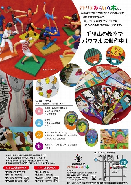 アトリエみらいの木のジュニア造形クラスは3年から6年の受講生がいらっしゃいます。まず最初に学年表記のおことわりがあります。表記の学年は前年度(3月まで)のものです。6年になっている方は4月の現在では中学1年に進学されていますことを、ご了承くださいませ。昨年から吹田メイシアター展示室での発表となりましたが、多くのご観覧いただいた方々からあたたかいメッセージをいただき、大変感謝しております。ジュニアの受講生たちの手元にメッセージカード届けることができ、大変な励みになったと思います。今回もメッセージカードをご用意しておりますので、素敵なメッセージをお贈りいただけたら幸いです。