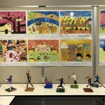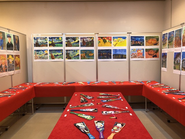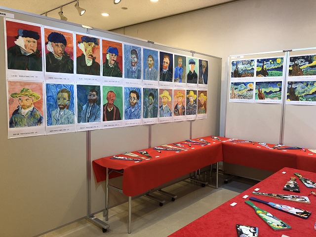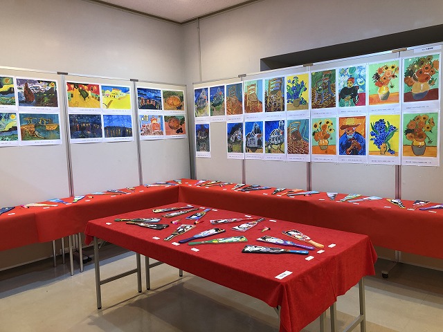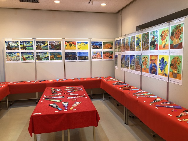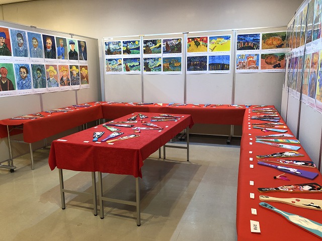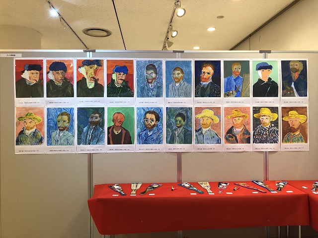 年に2回取り組んでいるキャンバスの自由制作のうちの1点と楕円の「カラフルな自画像」を展示しております。また2024年はオリンピックの開催がありましたので、「スポーツする人」の工作を作りました。実際に見ていただきますと、今にも動き出しそうな造形に驚かれる方もいらっしゃることと思います。また昨年春には、ゴッホ作品の模写に取り組み、「ゴッホ美術館」として展示しています。