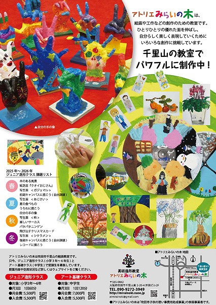 本日は『アトリエみらいの木第14回ジュニア作品展2026』にご来場いただきまして、誠にありがとうございます。本展では、アトリエみらいの木のジュニア造形クラス(小学3~6年)の皆様が1年間で手がけた多様な作品を展示しております。