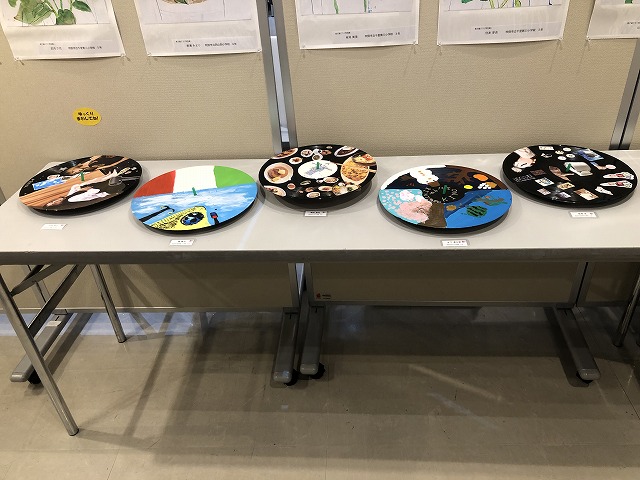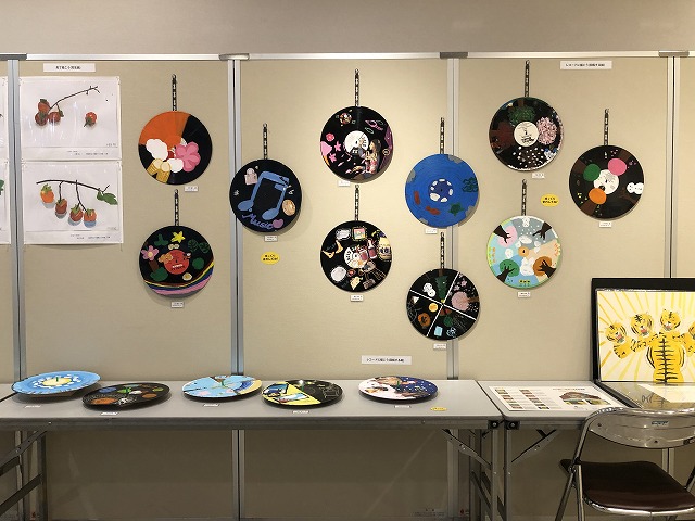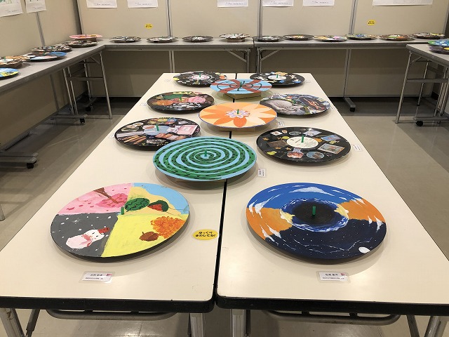 各自が自由に描きたいものを表現したキャンバス制作。自然の空気感まで描き出そうと試行錯誤した「木のある風景」。回転する面白さを追求したレコードの絵。